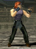 Hwoarang's player 1 outfit is still a white taekwondo dobuk, but it now consists of a sleeveless shirt with blue outlines and a yin-yang on the left side of the chest, with a red eagle/flame design on the back referring to his Blood Talon nickname. His pants are the same design as his shirt and also feature a red design on his right leg. He has a black belt with his name printed on it and a yin-yang matching his shirt. He has blue fingerless gloves with a blue design and some writing on them, and wears black sneakers. His hair is unchanged from Tekken 3, however he is no longer wearing the bandanna.